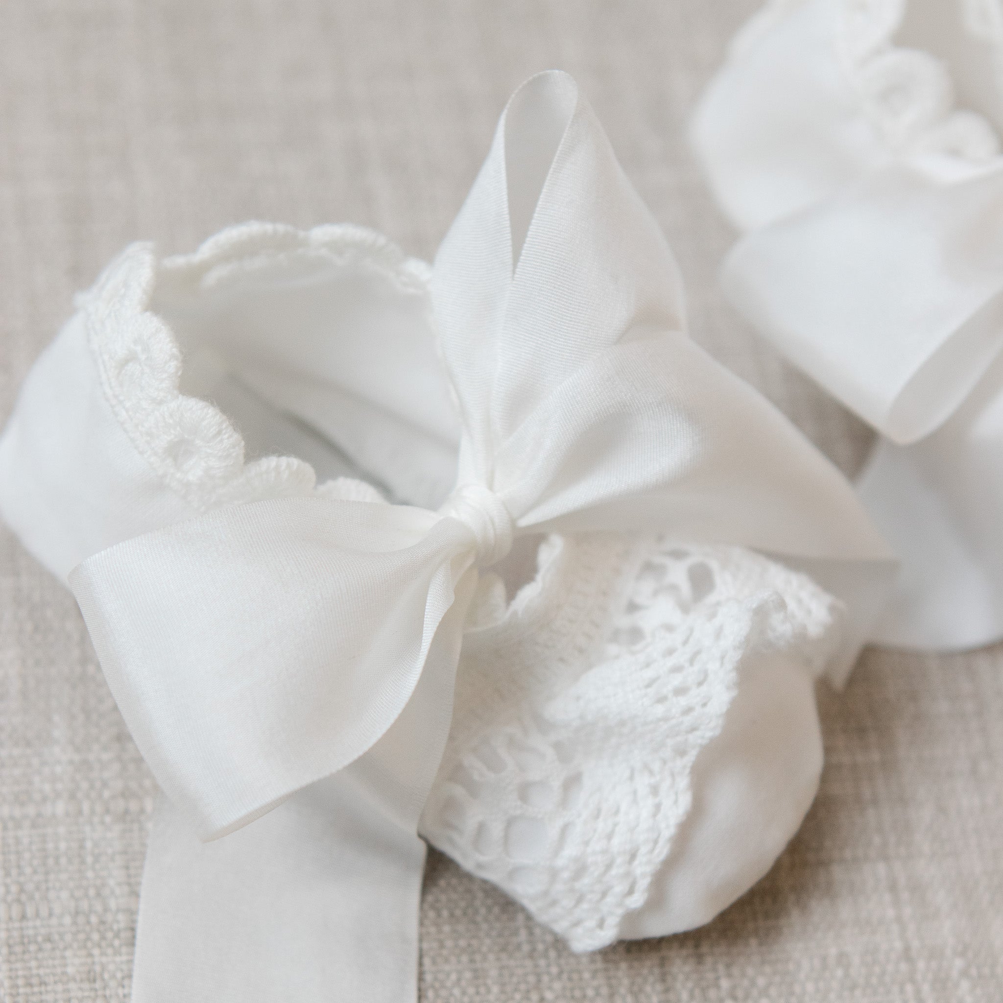The Emily Booties pair perfectly with her Emily Lace Baby Dress! These darling booties are made with a soft 100% cotton lace in light ivory and are adorned with a unique venice lace trim. 100% silk ribbon ties are an elegant touch and help keep her booties snug throughout the day.