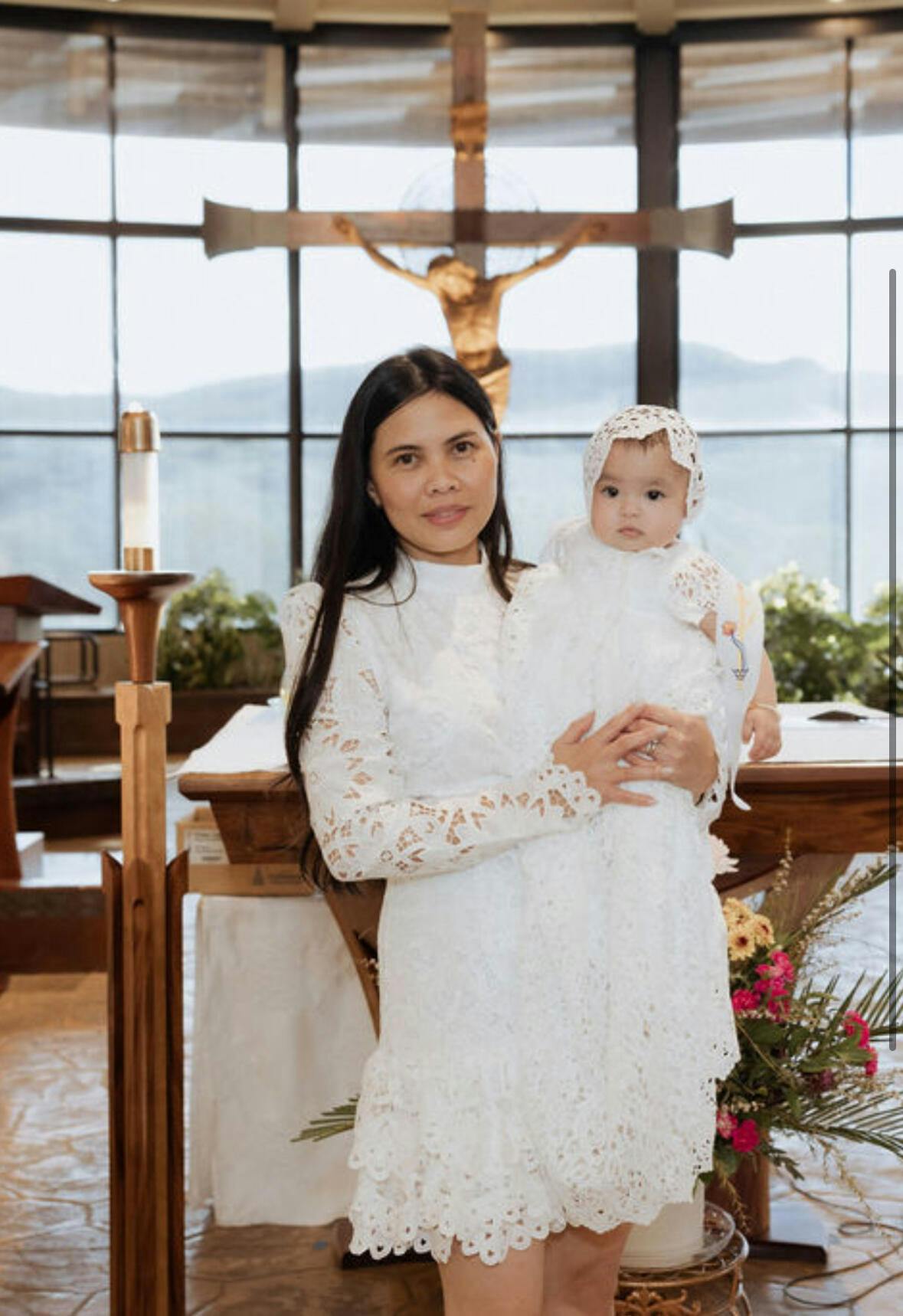 A full-length elegant baptism gown. This gown is hand-crafted down to the last detail. Made with a cotton under gown in light ivory featuring an all-over lace overlay for a detailed look not found on most gowns. Lace bodice with cap sleeves add to the uniqueness of the gown. Ties in back with a sash. Add her matching Lola lace bonnet or headband so she has her complete look.