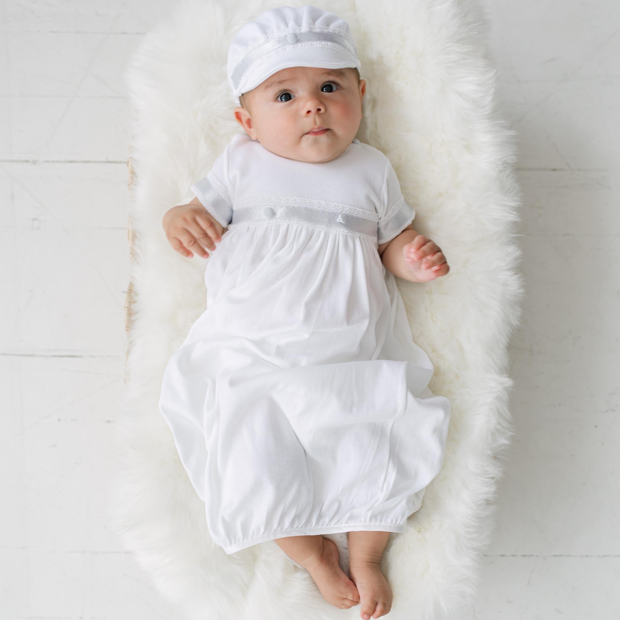 His Christening day, Bris, or any other special occasion will be made all the more special with the Henry layette! Luxuriously styled in 100% pima and french terry cottons and featuring our exclusive blue silk ribbon and white venice lace trim, blue linen buttons at the shoulders make changing him a breeze. Pair with the matching Henry brim cap and it's sure to make him the talk of the day!