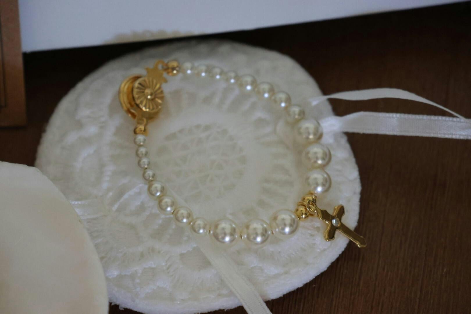 We use high-end Austrian crystal simulated pearls that are crafted to have a flawless finish and a beautiful luster. Hand-beaded with cream crystal pearls, gold-plated beads and gold-plated clasp box clasp for a secure fit. Handmade for a quality heirloom finish. A beautiful Gift for Baby, Girls and Mom!