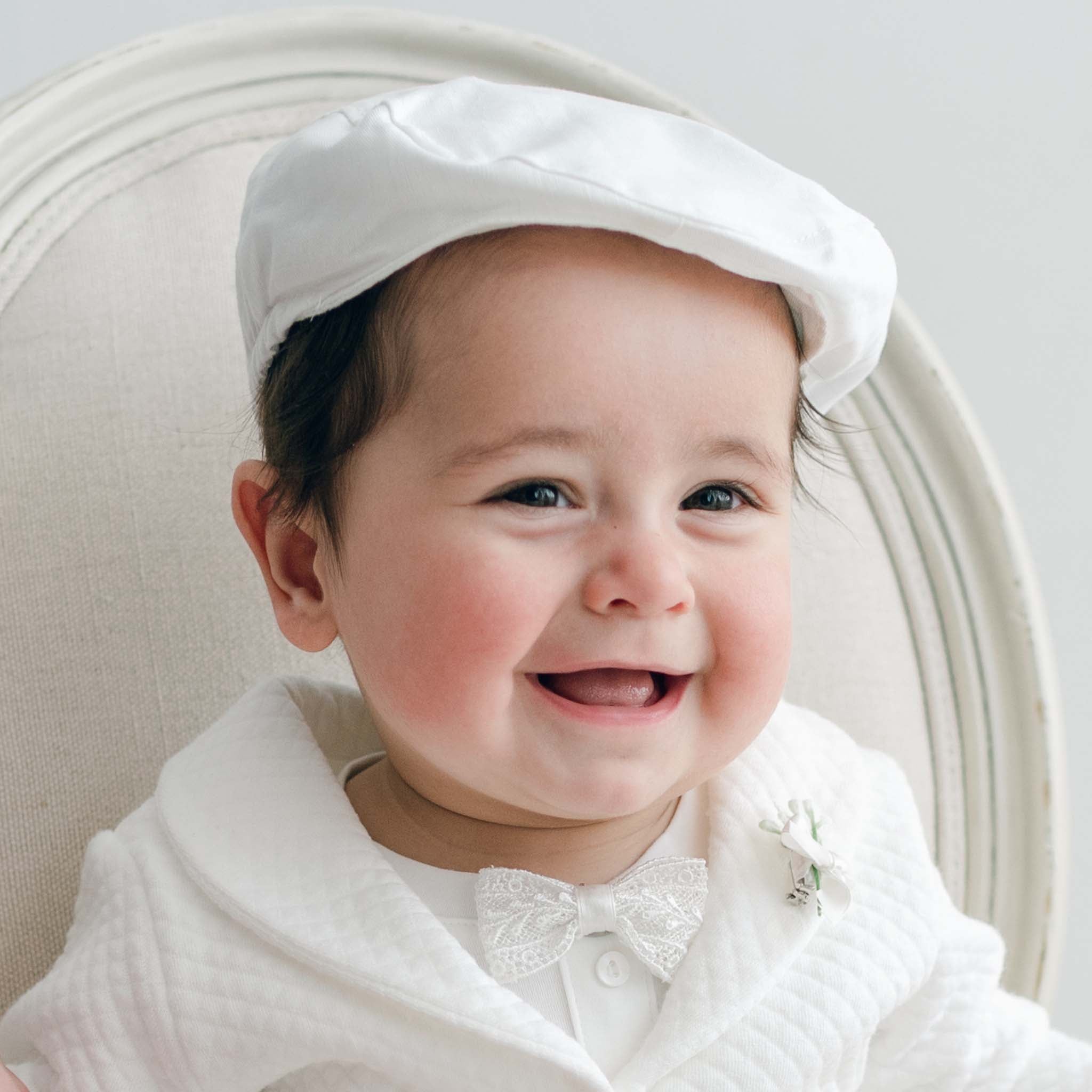 The perfect way to complete his Oscar Christening outfit! Using the same linen used to make the Oscar romper, this newsboy style hat is the perfect match to wear for his very special day. Fully lined and featuring a soft elastic band around the back half to ensure a snug and comfortable fit that he will be able to wear all day.