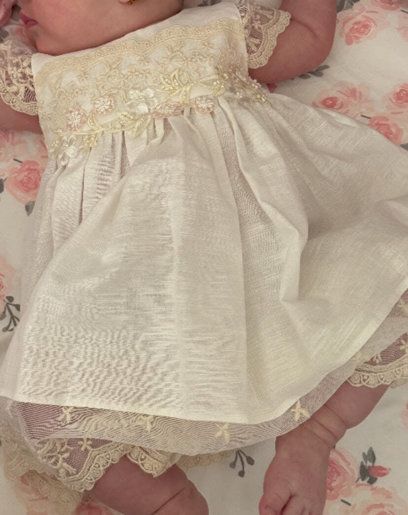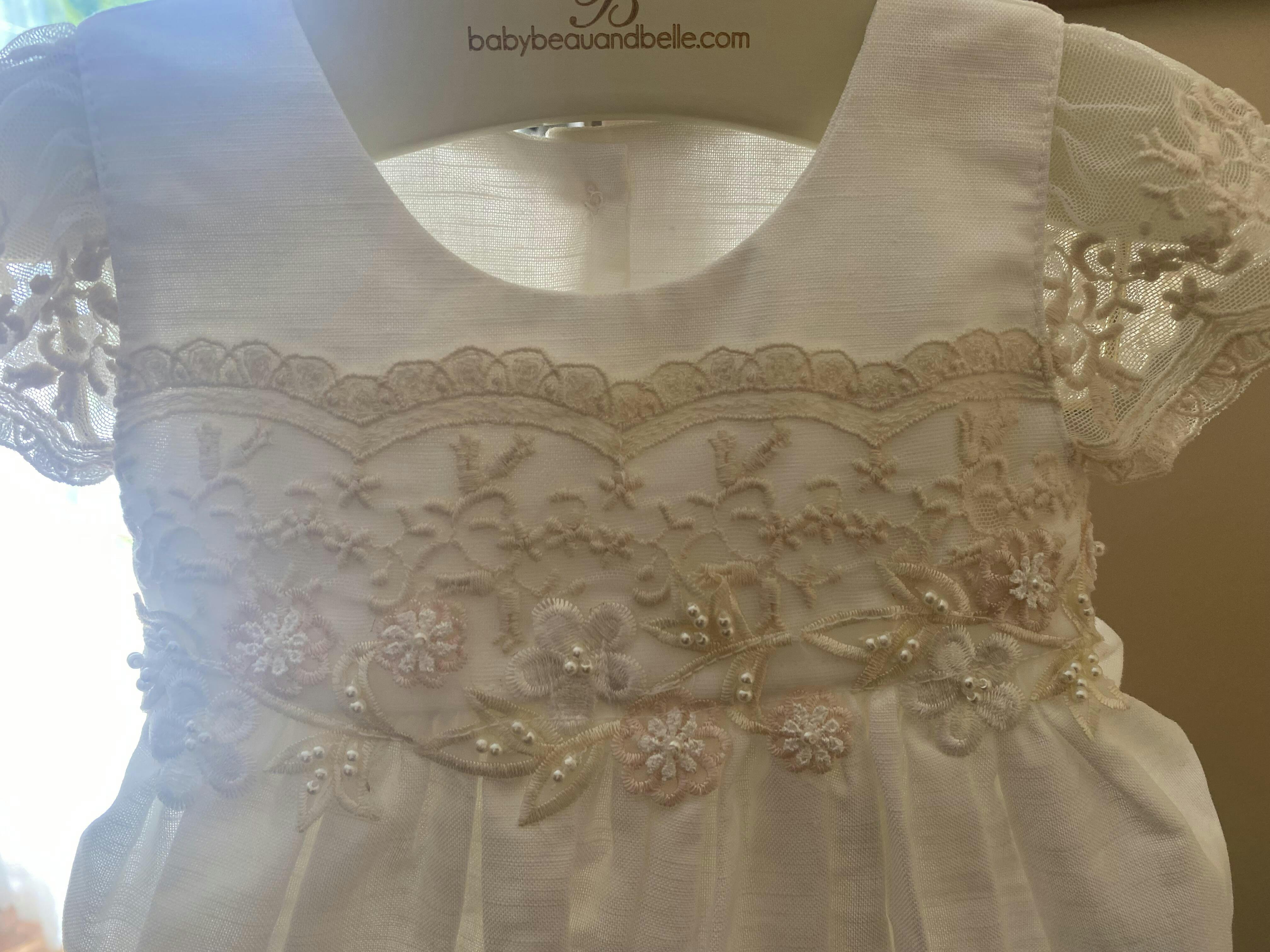 A nod to our traditionally styled Jessica christening gown, the Jessica dress & bloomer set is a shorter cut for the same classic look that will make this dress perfect for going from ceremony to party! Made in our soft linen/cotton blend to be extra comfortable for your baby, while still offering a classic and beautiful design. Featuring a champagne embroidered netting across the bodice for stunning detail and beautiful contrast to the ivory linen. The detailed floral applique in soft pastel shades and added pearl style beading, gives the dress that subtle vintage touch. The matching lace flutter sleeves add a soft, feminine look. Dress fastens with buttons in back. Additional champagne lace along the bottom of the dress and legs of the bloomers are another beautiful touch that's reminiscent of antique designs, and help to make this dress set unique. Completed with sash ties on back. Not only is the bow a beautiful finish, it creates a lovely tailored fit on her.