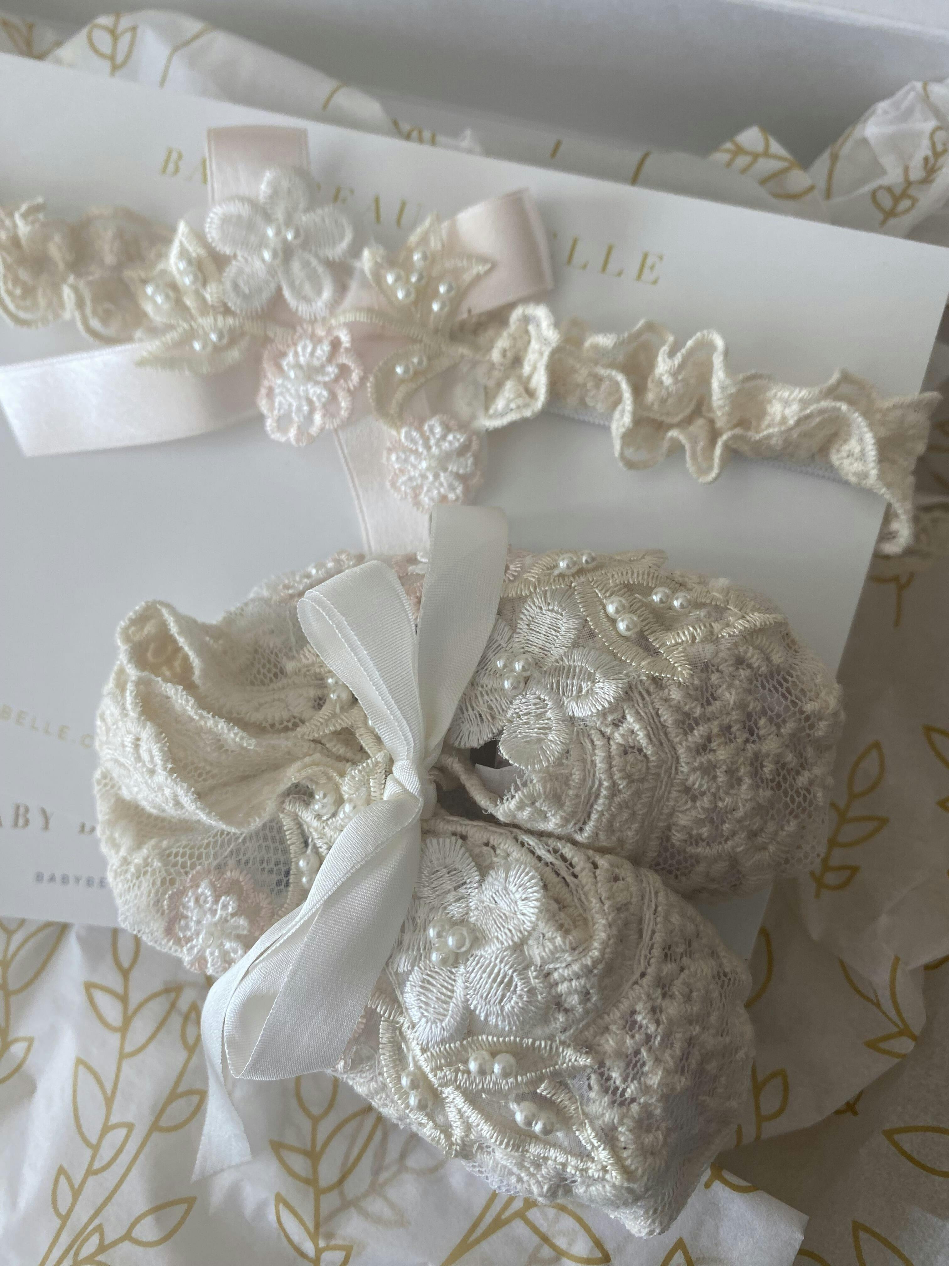 Create an heirloom set for her by pairing other matching accessories from our Jessica collection including the stunning lace booties, blanket and bonnet.