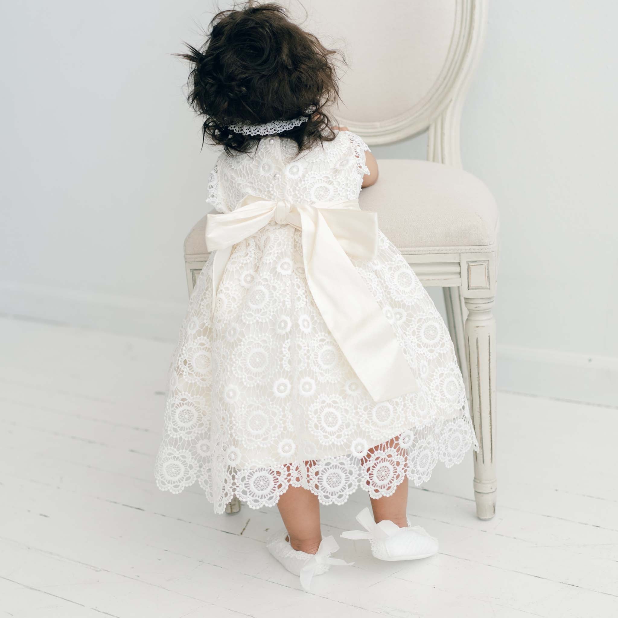 A perfect blend of traditional fashion and contemporary style, the Poppy Christening dress is a sweet and elegant design for her Baptism day. This beautiful designer Christening dress is hand crafted with a rich silk dupioni lining in a shade of ivory. The subdued silk color is the perfect shade to enhance the intricate floral lace that lays on top. Adorable lace cap sleeves and lace scallops on the bodice and skirt hem add details unique to our girls christening clothes. Pearl style button closures at the bodice back finish the exquisite look. It is made to fall about knee length depending on her height. Pair with her matching lace headband, christening bonnet, christening booties, christening bib, and snuggly blanket for an heirloom set that will be adored for generations.