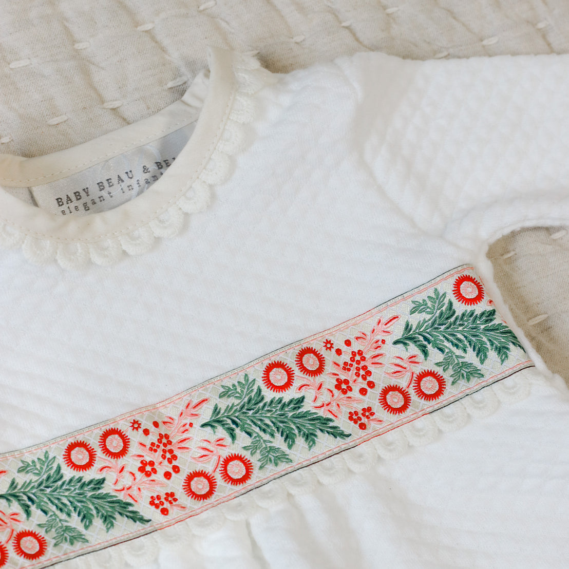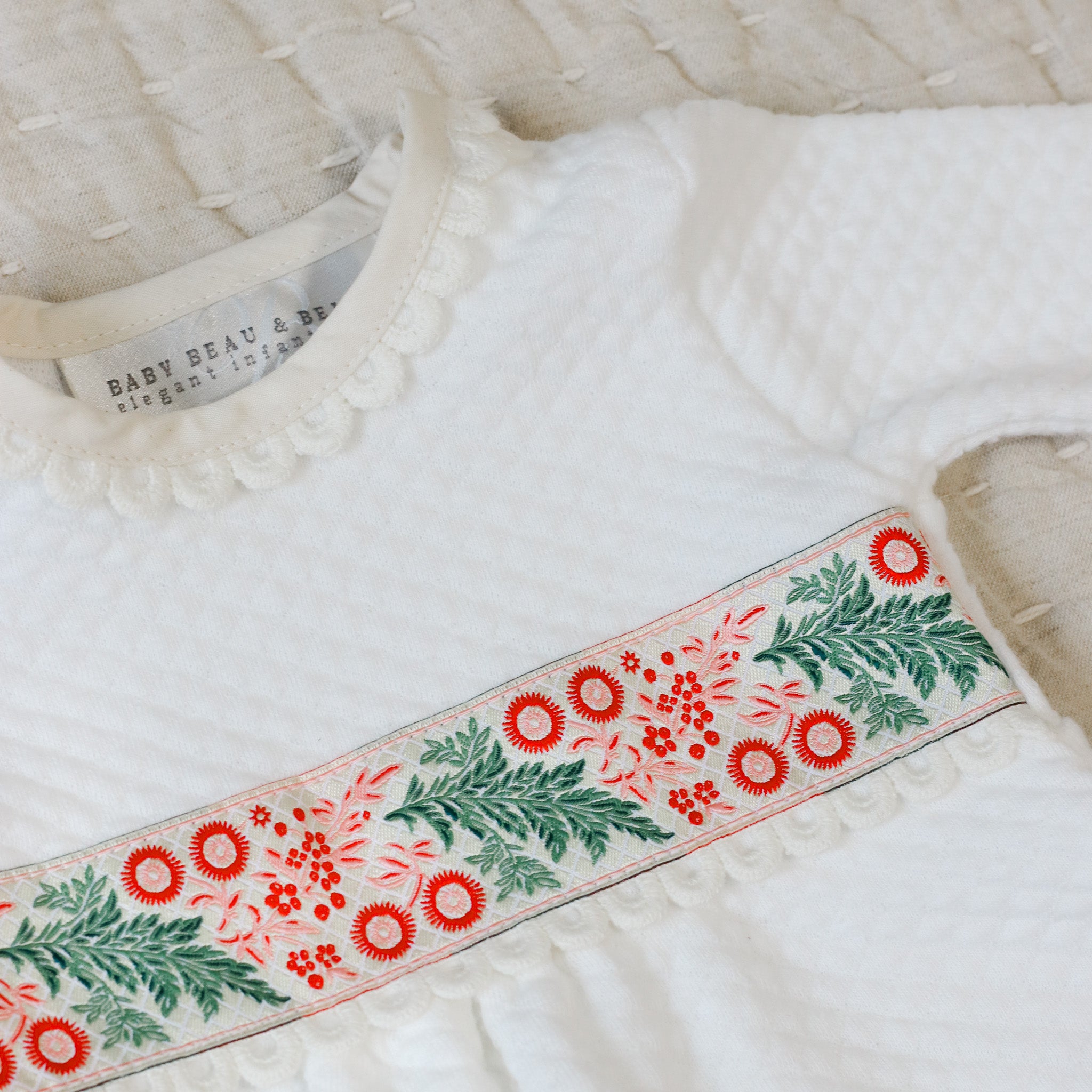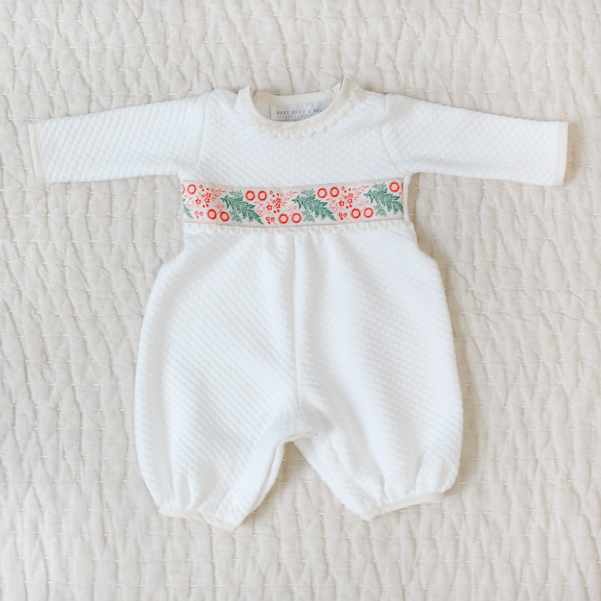 This keepsake baby Christmas outfit, made in a soft, ivory quilt of 100% cotton is perfect for your newborn baby. Woven jacquard ribbon patterned in a red and green flower and leaf pattern provides the trim at the waist, adding a touch of festivity to any holiday occasion. The hidden snaps at the legs make diaper changes easy. Buttons at shoulders allow for ease getting her into her beautiful baby romper. The pants are gathered at the hem, creating the sweetest bloomer effect and wrapping your baby in warmth. Made to fall about ankle length depending on her height. This newborn Christmas outfit can be paired with matching blanket or headband, or purchased in a gift set with a plush toy in a coordinating ribbon.