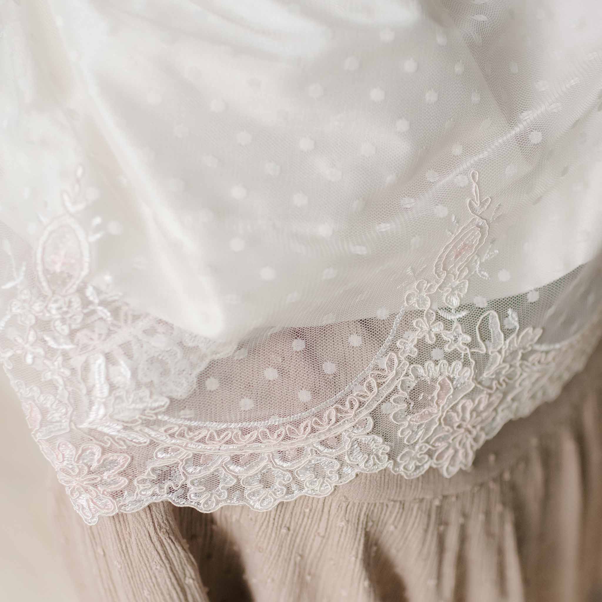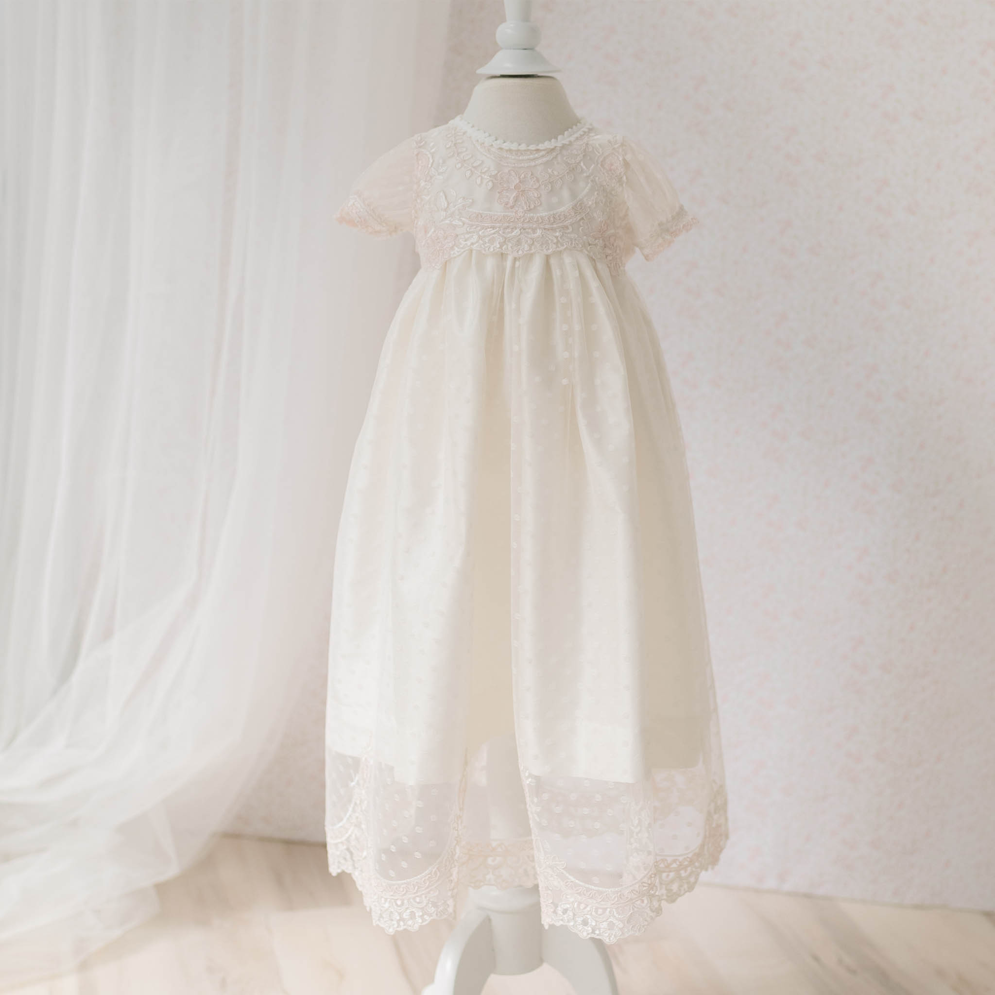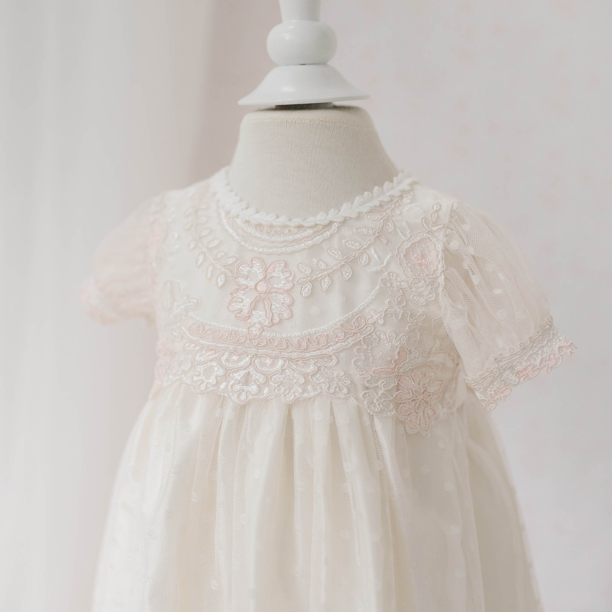 Using the same materials as our Elizabeth gown, this newborn gown handcrafted and beautifully detailed for smaller baby girls. The a more lightly embroidered style of our intricately detailed pink and ivory dotted mesh Elizabeth lace is as elegant as it is comfortable, and its details are enhanced by the beautiful silk underneath. The rich silk Dupioni lining is ivory for a look that will have your guests thinking it is a family heirloom gown. Our vintage pink champagne Dupioni silk sash ties allow you create a perfect fit, while adding a touch of color to bring out the lace details. The skirt is designed to fall just past her toes, and the gorgeous scalloped lace at the hem adds a timeless beauty while not being overwhelming to newborn! A matching corded pink and ivory edge lace add depth and richness, while the pearl style buttons at the bodice finish the piece and allow a wonderful fit. Includes her matching sheer lace bonnet with silk ribbon ties that frames her little face perfectly on her Christening or Baptism day. This is a Baptism gown that will be passed down and appreciated for generations to come.