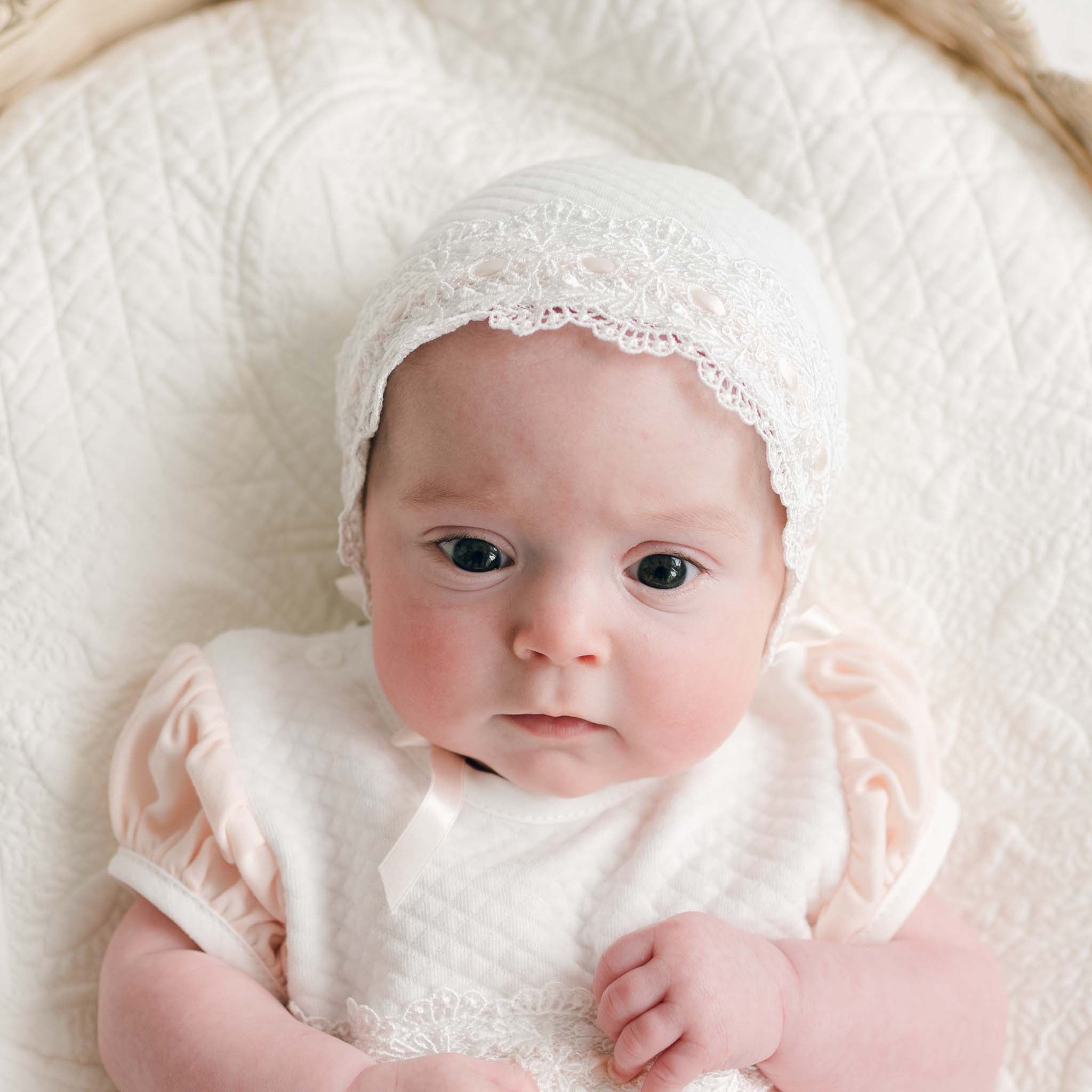 The Emma quilt bonnet was made to match perfectly to her Emma layette! Made with our cozy plush quilted cotton in light ivory, a soft and breathable material perfect for the little one wearing it. Detailed with a beautiful ivory lace with light pink silk ribbon woven throughout. Light pink silk ribbon ties make it easy to adjust and creates a gorgeous finish, whether you tie it to the side or directly under her chin.