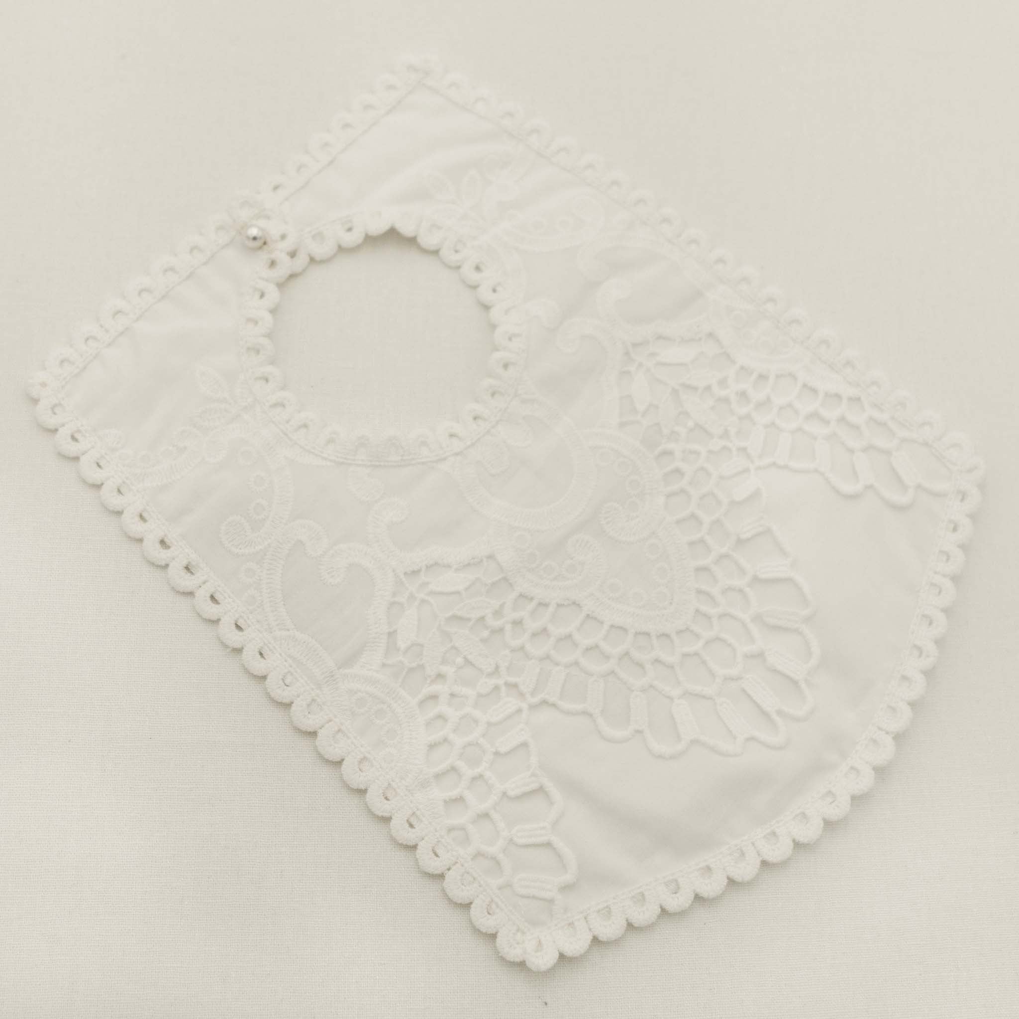 The Lily Lace Bib is a beautiful way to protect her Lily Christening Gown and Dress! Made with a 100% cotton lace in light ivory. Unique squared design with enough coverage to keep her dress protected. Darling circle lace trim. Fastens with an elegant button closure.