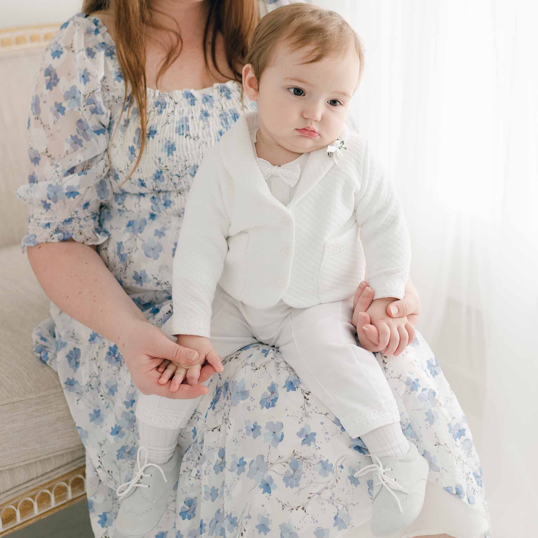 This cozy and chic 3-piece suit is perfect for your precious baby boy's special day. The shorts and pants feature a delicate white linen blend, accented with a charming button detail at the waist and Venice lace along the hem. A comfortable elastic waistband ensures an easy fit. The white quilted cotton jacket is super plush and adorned with matching lace trim on the cuffs and pockets. The white cotton/rayon blend shirt underneath is also delightfully soft, ensuring your little one's comfort throughout the day. This outfit is ideal for special occasions like weddings, baptisms, christenings, or first birthday celebrations. Your handsome young man will surely make a stylish statement in all those photographs you capture.
